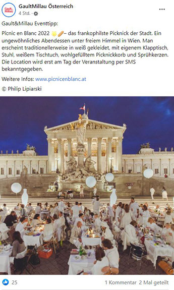 Bereits zum siebten Mal wird heuer das frankophilste Picknick der Stadt veranstaltet. Nach der erzwungenen Epidemiepause findet am Samstag, den 25. Juni 2022 ab 17:00 Uhr das Pîcnic en Blanc in Wien an einem bis zum Schluss geheimen Ort statt. Französische Delikatessen, Chansons und Romantik inklusive.