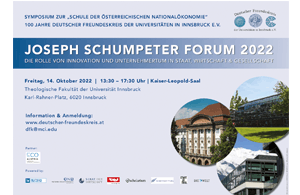 Der SENAT der Wirtschaft lädt am 14. Oktober herzlich zum Joseph Schumpeter Forum nach Innsbruck ein. Die Veranstaltung widmet sich dem Thema “Die Rolle von Innovation und Unternehmertum in Staat, Wirtschaft & Gesellschaft”. Das Symposium zur „Schule der Österreichischen Nationalökonomie“ findet anlässlich des Jubiläums 100 Jahre Deutscher Freundeskreis der Universitäten in Innsbruck statt.