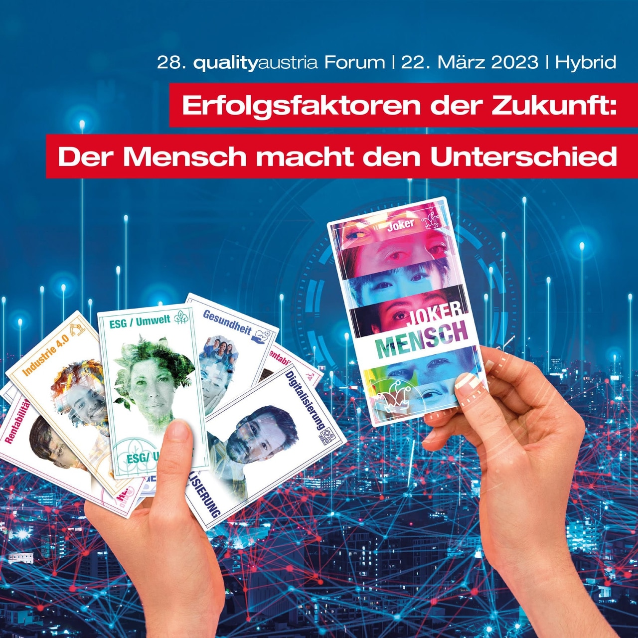 Themen wie Digitalisierung, Industrie 4.0, Nachhaltigkeit und ESG schreiben die Spielregeln erfolgreichen Wirtschaftens neu. Beim 28. qualityaustria Forum erfahren Sie, warum der Mensch auch in Zukunft der entscheidende Faktor bleibt. Eröffnet wird die Veranstaltung von den qualityaustria Geschäftsführern Christoph Mondl und Werner Paar. Top-Speakerinnen wie Human Capital Evangelist Steffi Burkhart, Bestseller-Autorin Kerstin Plehwe und Service-Perfomance-Beraterin Sabine Hübner verraten Ihnen, wie Sie erfolgreich im Spiel bleiben. Die besten Karten haben Sie mit einer zeitgemäßen Unternehmenskultur, einem ganzheitlich-systemischen Verständnis und zukunftsweisenden Leadership-Strategien. Am 22. März 2023 erfahren Sie in Salzburg und online, wie Sie das Potenzial aller Generationen nutzen, geänderte Anforderungen rechtzeitig erkennen und das Integrierte Managementsystem anhand von Beispielen aus der Praxis als entscheidenden Joker ausspielen.