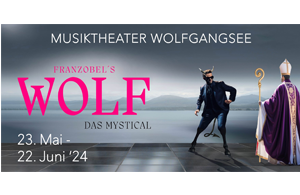 Anlässlich des Jubiläumsjahres 2024 – 1.100 Jahre Heiliger Wolfgang – lädt die Wolfgang Betriebs-gGmbH zur Präsentation des Leading Teams, der Hauptdarsteller:innen und von musikalischen Highlights in „Wolf ≈ Das Mystical“ auf der neuen Salzkammergut ≈ Seebühne am Wolfgangsee ein. Zudem wird die Zusammenarbeit der Mystical-Autoren mit der Kultband Opus vorgestellt, die den ersten Wolfgang-Song aus „Wolf ≈ Das Mystical“ direkt aus dem Studio mitbringen.