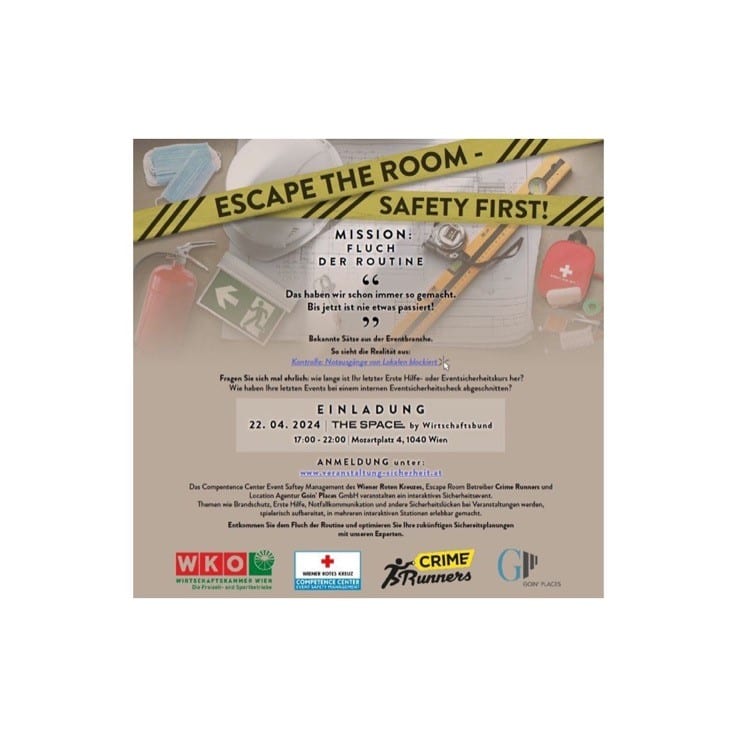 Das Compentence Center Event Saftey Management des Wiener Roten Kreuzes, Escape Room Betreiber Crime Runners und Location Agentur Goin’ Places GmbH veranstalten ein interaktives Sicherheitsevent. Themen wie Brandschutz, Erste Hilfe, Notfallkommunikation und andere Sicherheitslücken bei Veranstaltungen werden, spielerisch aufbereitet, in mehreren interaktiven Stationen erlebbar gemacht.
