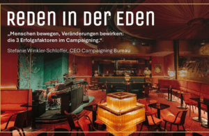 Am 14. November ist die Eden Bar Schauplatz eines weiteren spannenden After Work-Events der Fachgruppe Werbung und Marktkommunikation Wien. Die Campaigning-Expertin Stefanie Winkler-Schloffer, CEO Campaigning Bureau gibt Einblicke in erfolgreiche Kampagnen-Strategien, die nachweislich Veränderungen bewirkt haben.